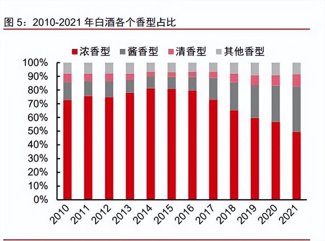 白酒种类繁多,细分可有十二大香型,市场份额最大的三种香型分别为浓香型、酱香型及清香型,市场份额占比分别为50%、30%及12%。